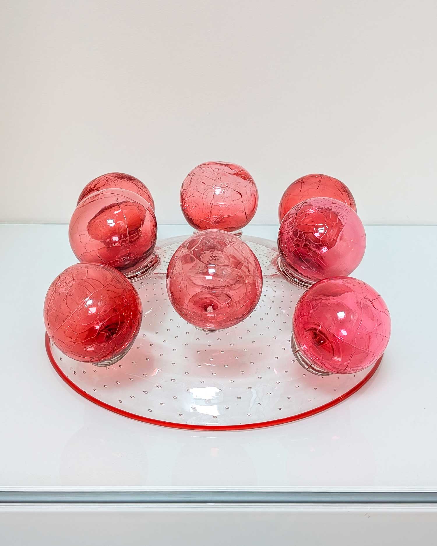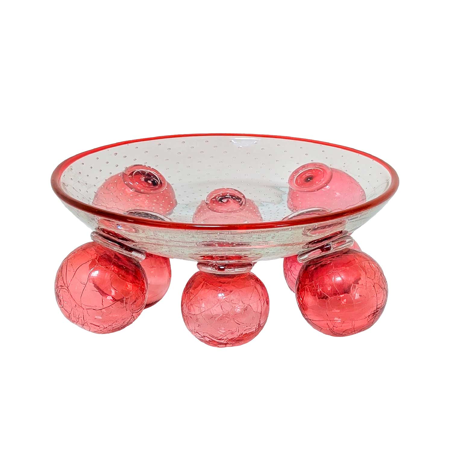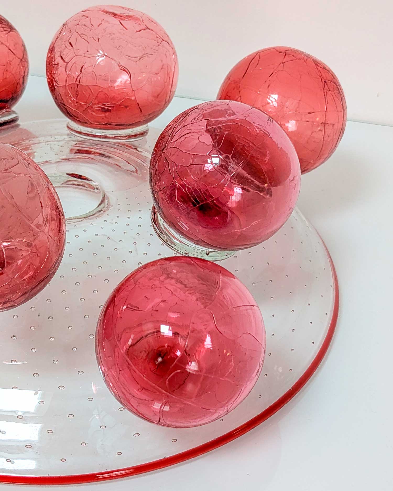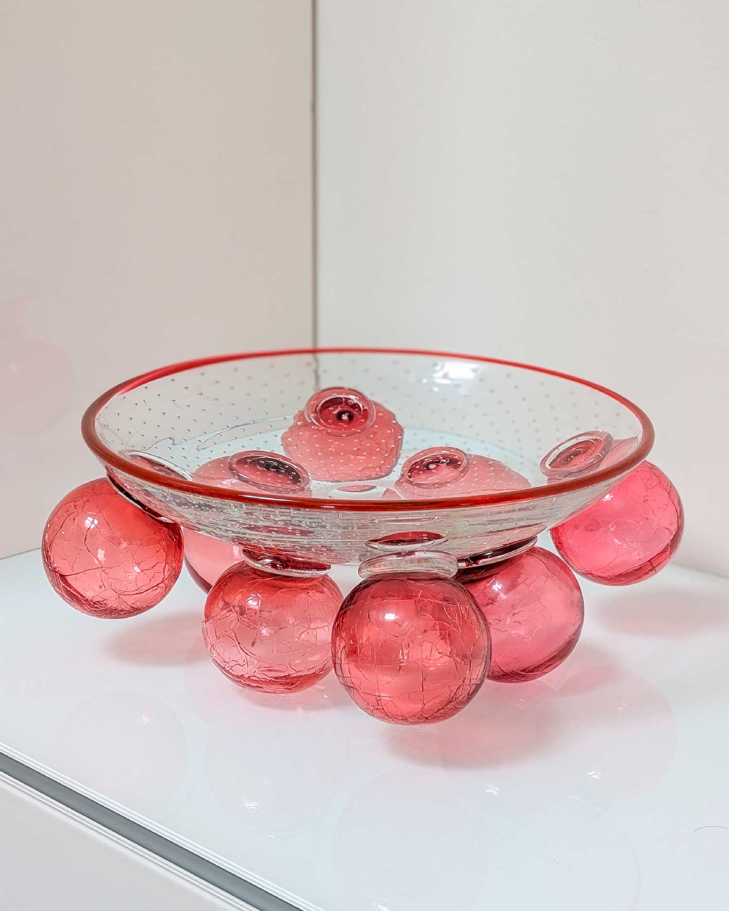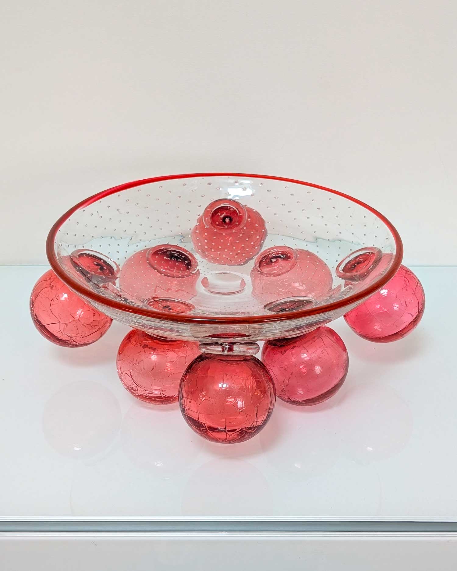 Coupe en verre soufflé modèle “Zet”, conçue par le designer tchèque Bořek Šípek pour la verrerie Ajeto dans les années 1980. Cette coupe en verre se distingue par sa composition sculpturale : un large bassin en verre transparent ponctué de bulles régulières repose sur une série de sphères en verre rose craquelé. Ce jeu de volumes et de textures capte la lumière et accentue l’intensité de la couleur.