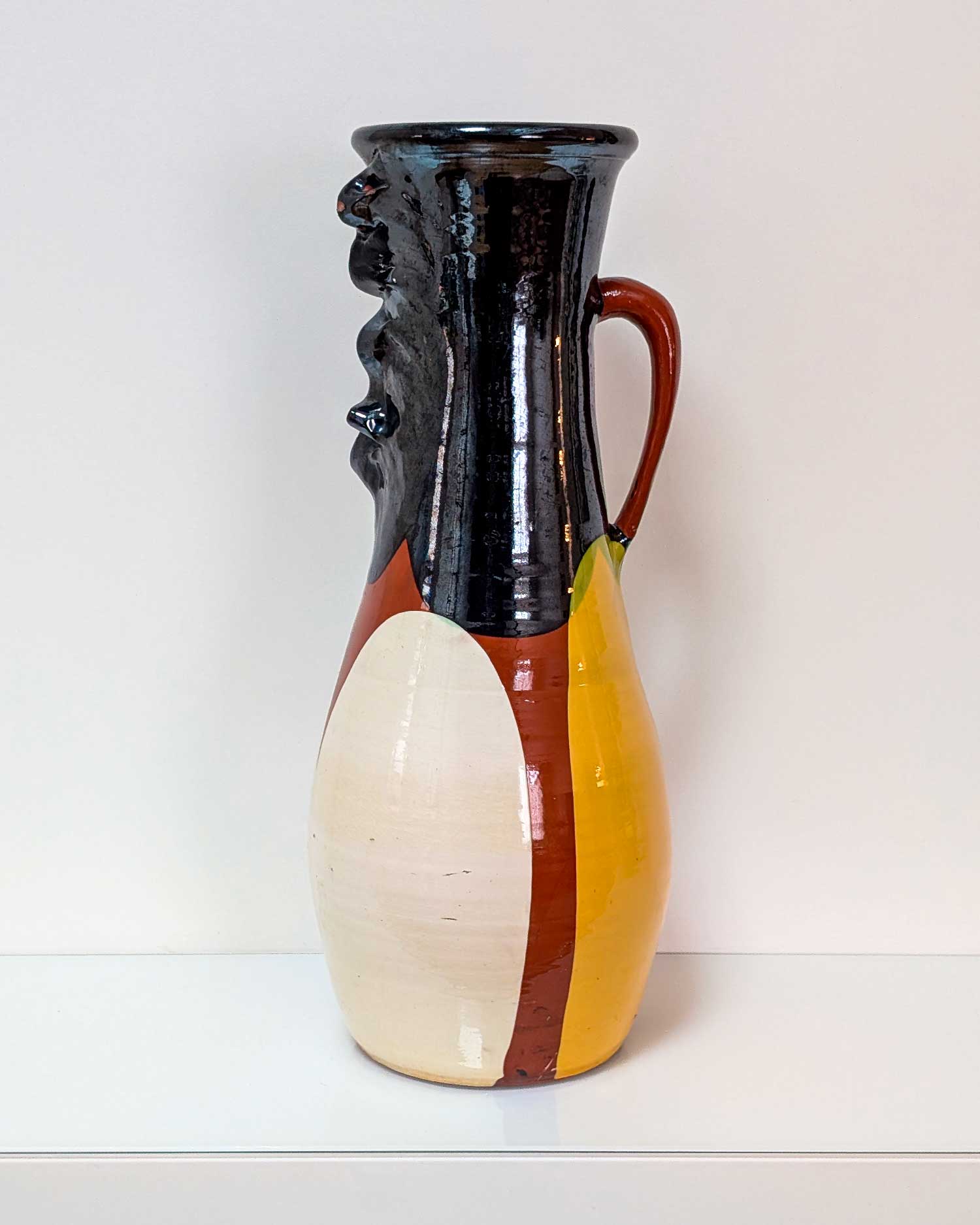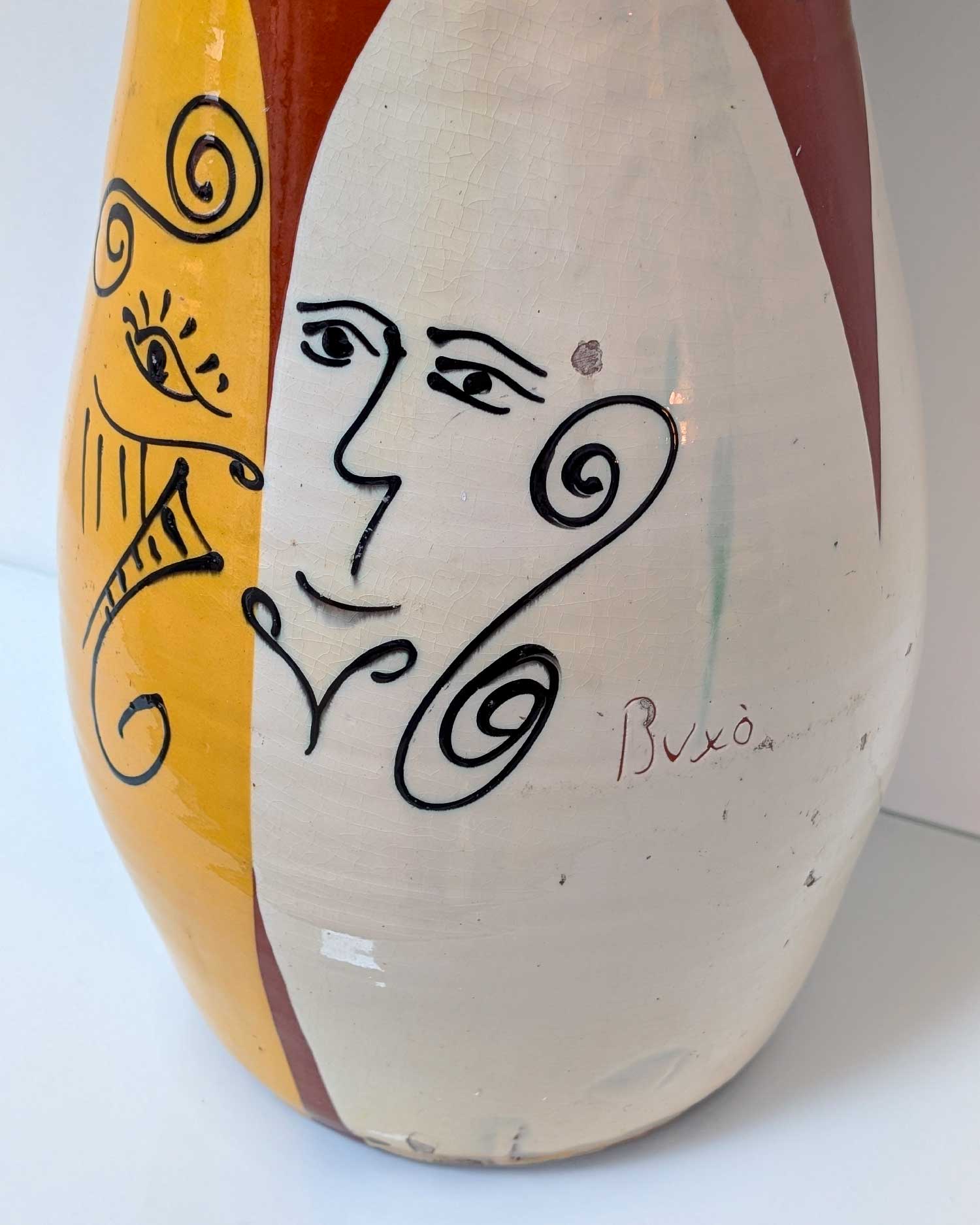 Signé Thomas Buxó, ce grand vase en céramique émaillée se distingue par ses proportions inhabituelles et par son décor expressif représentant un visage stylisé. Les émaux contrastés — noir, jaune, terracotta, vert et blanc cassé — renforcent sa présence et sa singularité.