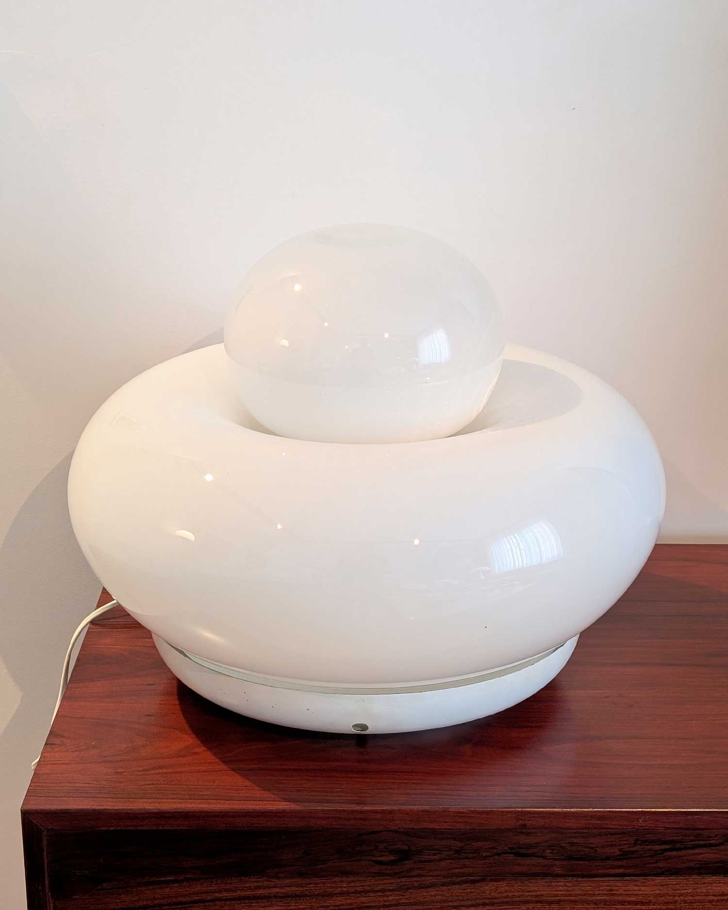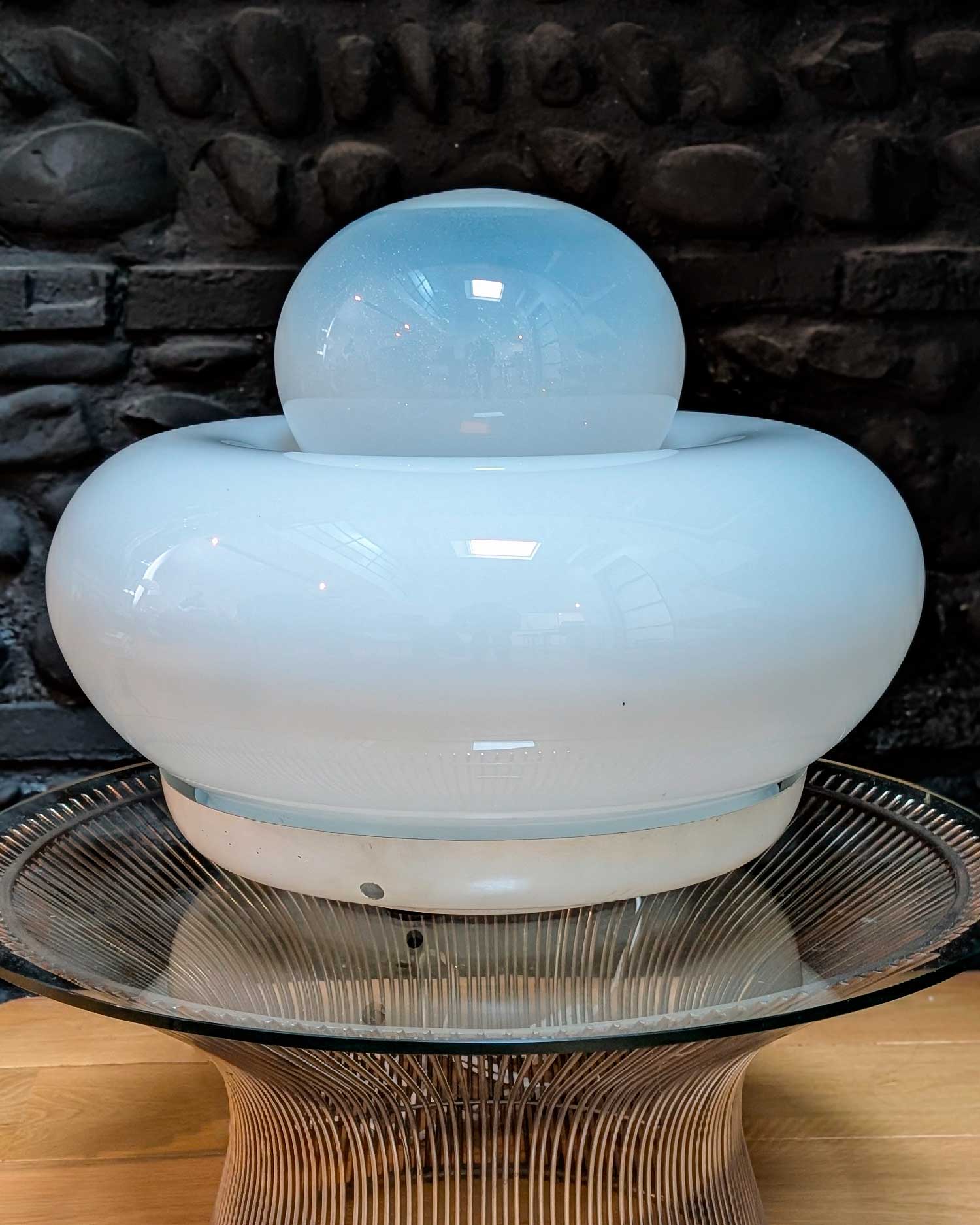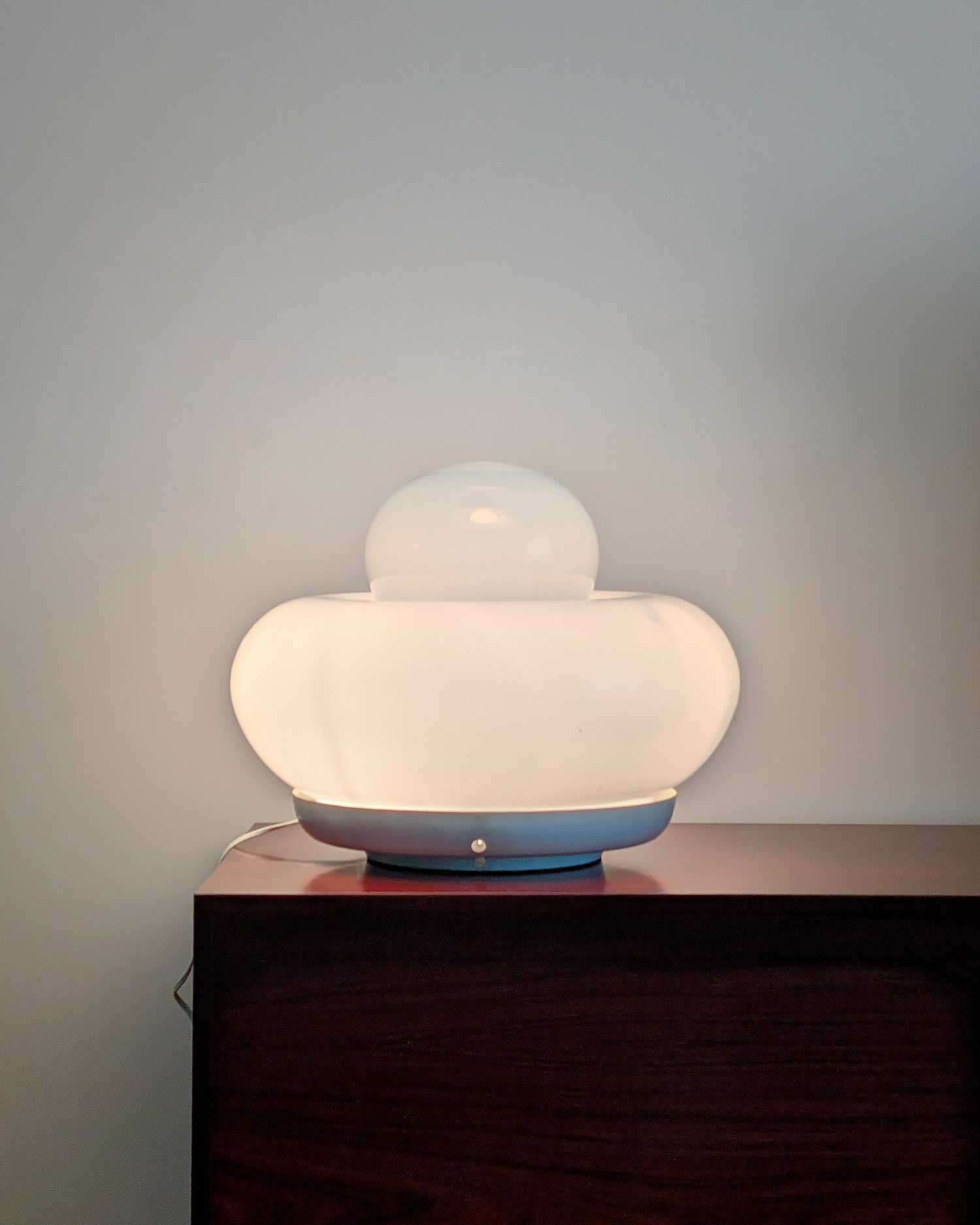 La lampe Electra, conçue par Giuliana Gramigna pour Artemide en 1968, se distingue par ses formes généreuses et son élégante simplicité. Sa structure en verre opalin repose sur une base en métal laqué, fixée par trois vis en périphérie.