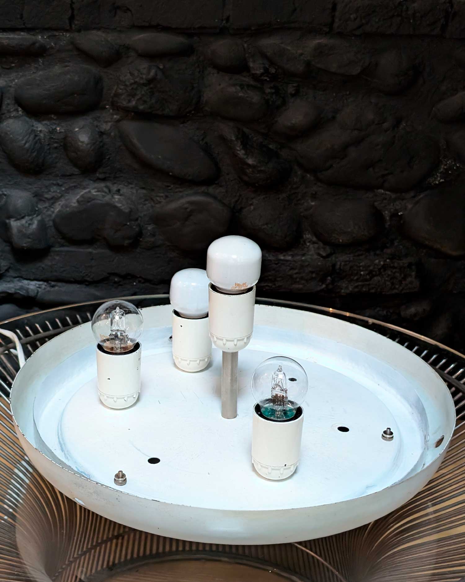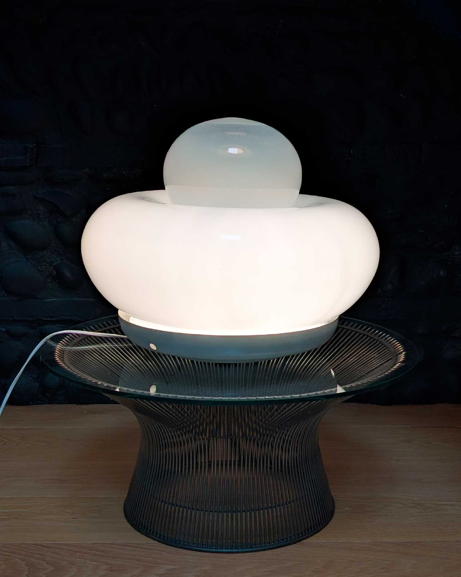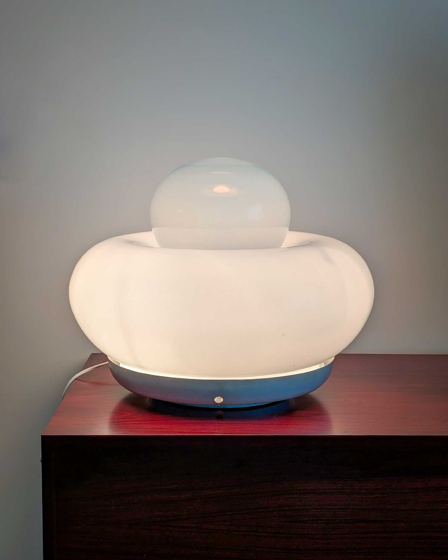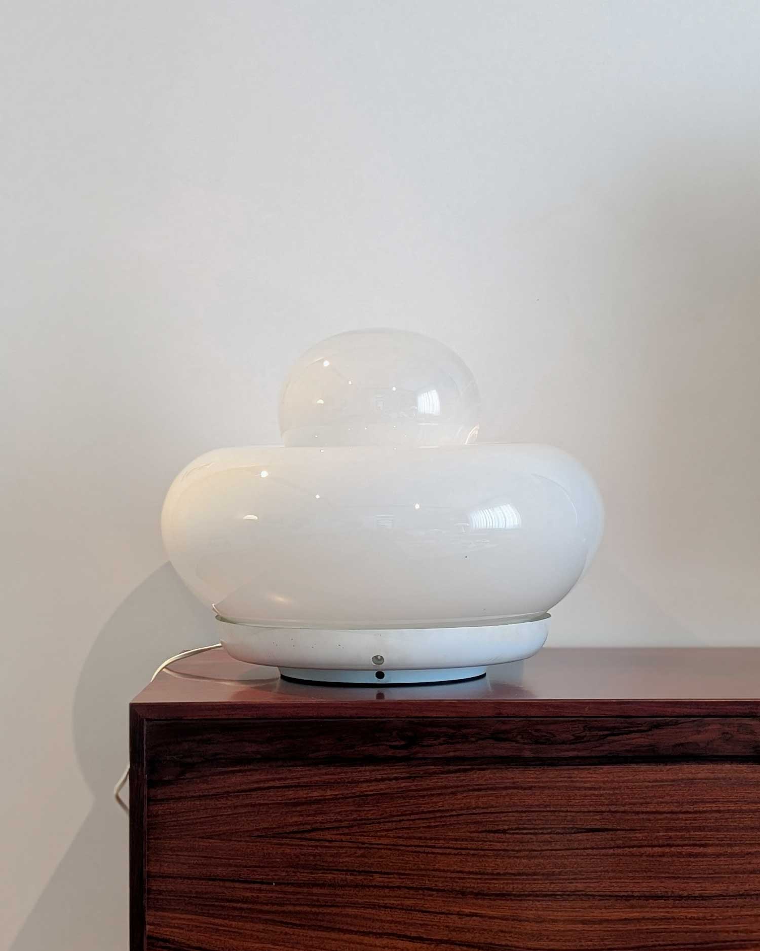 La lampe Electra, conçue par Giuliana Gramigna pour Artemide en 1968, se distingue par ses formes généreuses et son élégante simplicité. Sa structure en verre opalin repose sur une base en métal laqué, fixée par trois vis en périphérie.