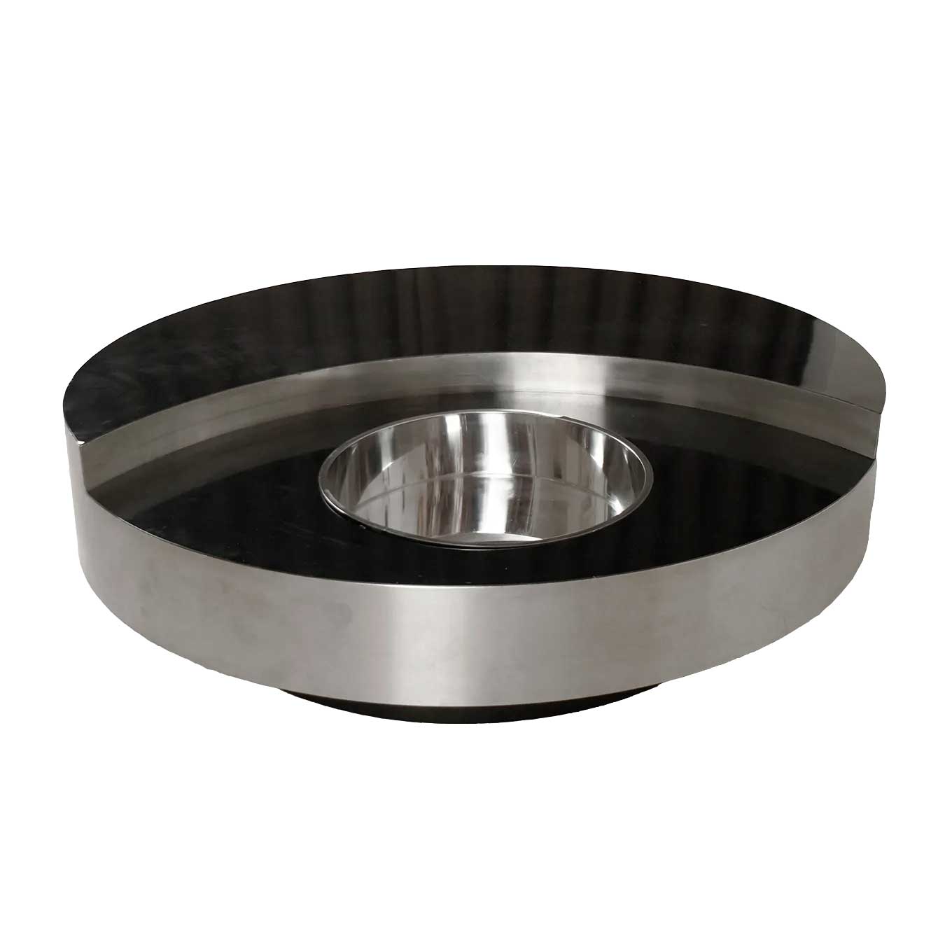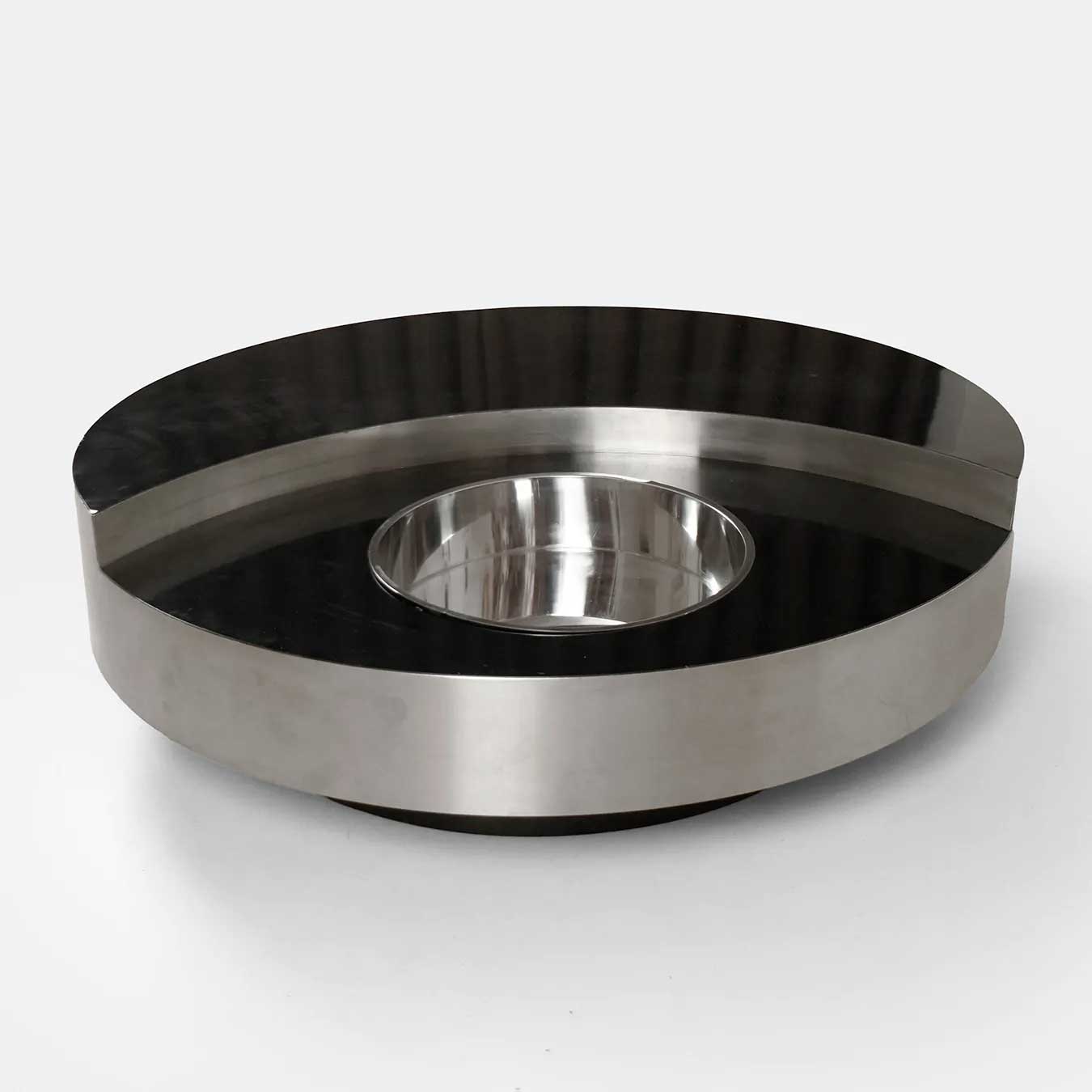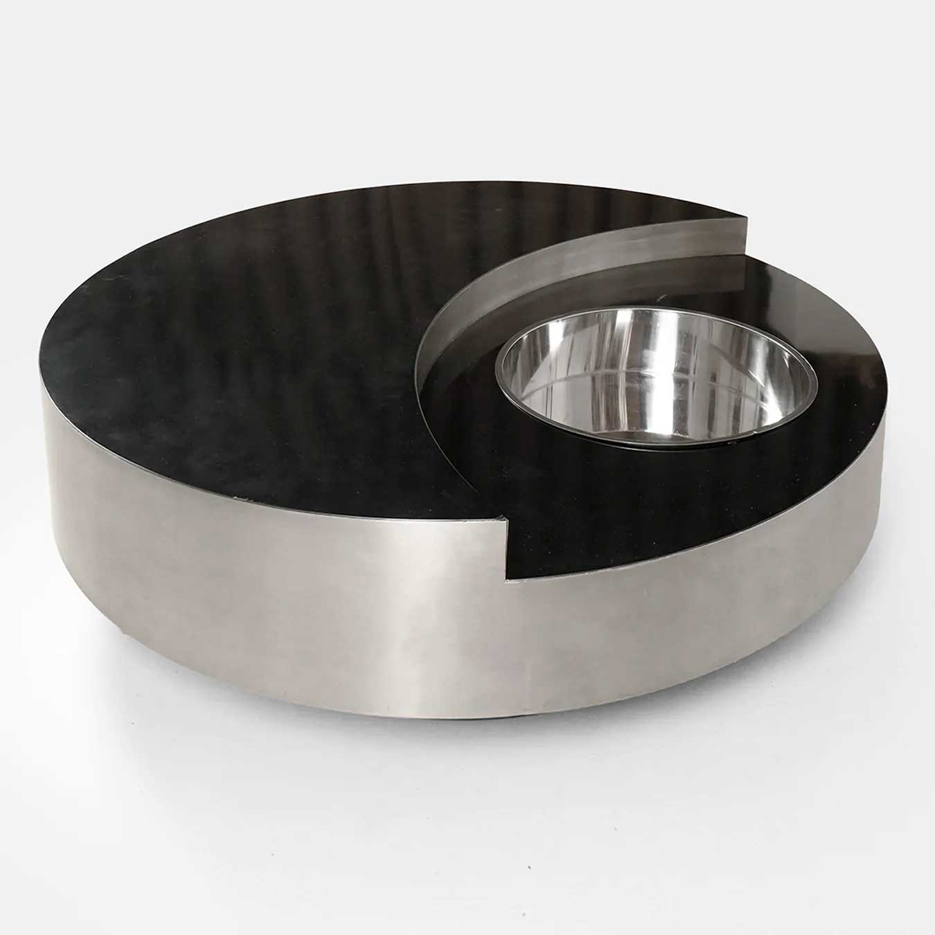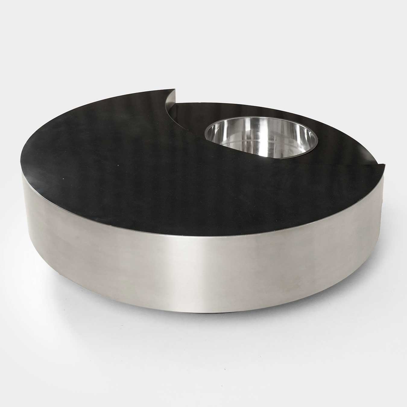 Édité en 1974, le modèle TGR (Tavolo Rotondo Girevole) se distingue par sa structure pivotante en bois, recouverte de formica noir, soulignée par de larges bandes en métal brossé. En son centre, un seau en métal chromé vient compléter l’ensemble, apportant une dimension à la fois fonctionnelle et conviviale.